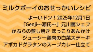 よーいドン よーいドン!2025年12月1日 ミルクボーイのおせっかいごはんレシピ一覧 2025年12月1日放送のよーいドン!ミルクボーイの「おっせかいごはん」のレシピを、まとめていきます。↓最新レシピも含めて今までのレシピを記事にしています。⇒「おせっかいごはん」「ミルクボーイのプロにお願い ちゃちゃっとワンプレート」のレシ... 2025.12.03 よーいドンレシピ